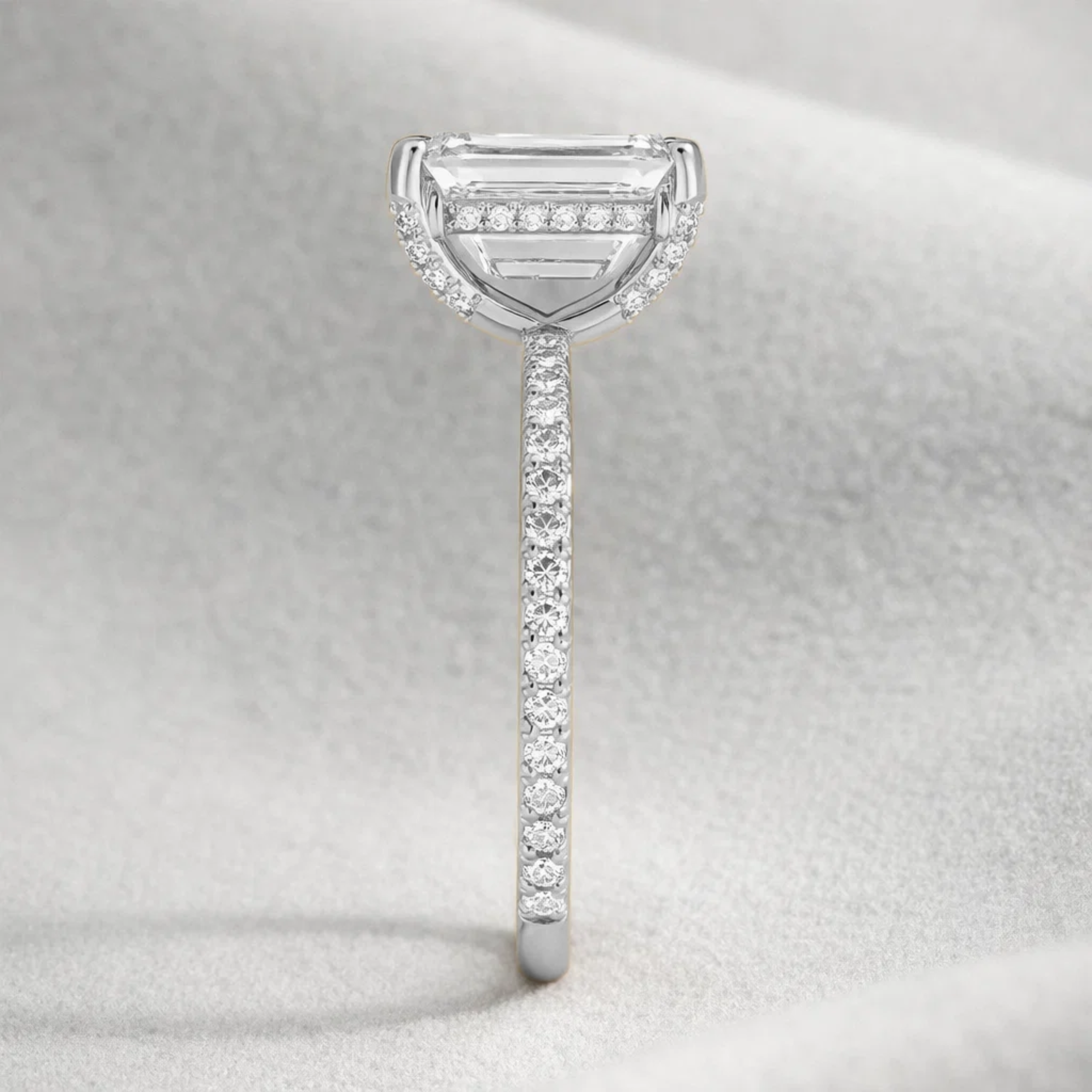 Available in 14K Yellow Gold, White Gold, and Rose Gold, this ring blend's classic structure with contemporary detailing. The hidden halo enhances sparkle without overpowering the sleek emerald silhouette, making it perfect for brides who love understated luxury with a statement finish.